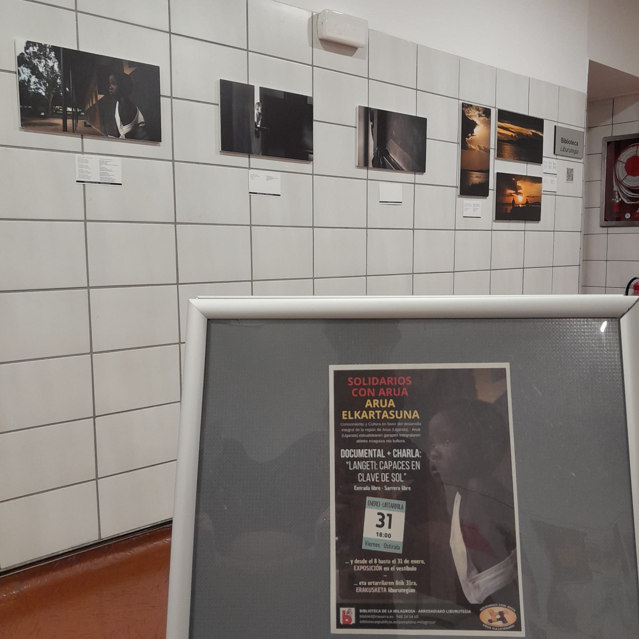 El vestíbulo de la Biblioteca de La Milagrosa de Pamplona acoge desde el 8 de enero la exposición fotopoética de Solidarios con Arua. La exposición estará instalada hasta el día 31 de enero, día en el que, a las 18:00h., se proyectará el documental «Langeti. Capaces en clave de sol» dirigido por Xabi Luna, tras el cual se celebrará un cineforum y se informará sobre la realidad y el contexto en el que desarrollamos los proyectos en Uganda. Queremos mostrar nuestro agradecimiento al personal de la Biblioteca de «La Milagrosa» por el interés mostrado y su amabilidad.